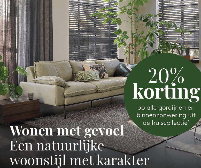 Wonen met gevoel, een natuurlijke woonstijl met karakter! Profiteer nu van 20% korting op alle gordijnen en binnenzonwering uit de huiscollectie.